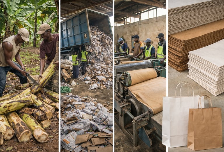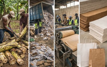 Chez Derrils Company, nous transformons la matière première naturelle et locale, comme les troncs de bananiers, et les papiers recyclés, en papiers de haute qualité destinés à la fabrication d’emballages sacs durables. Alliant innovation artisanale et respect de l’environnement, nous valorisons chaque ressource pour offrir des produits écoresponsables, solides et esthétiques, tout en contribuant à la réduction des déchets et à un futur plus vert.