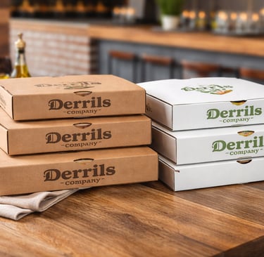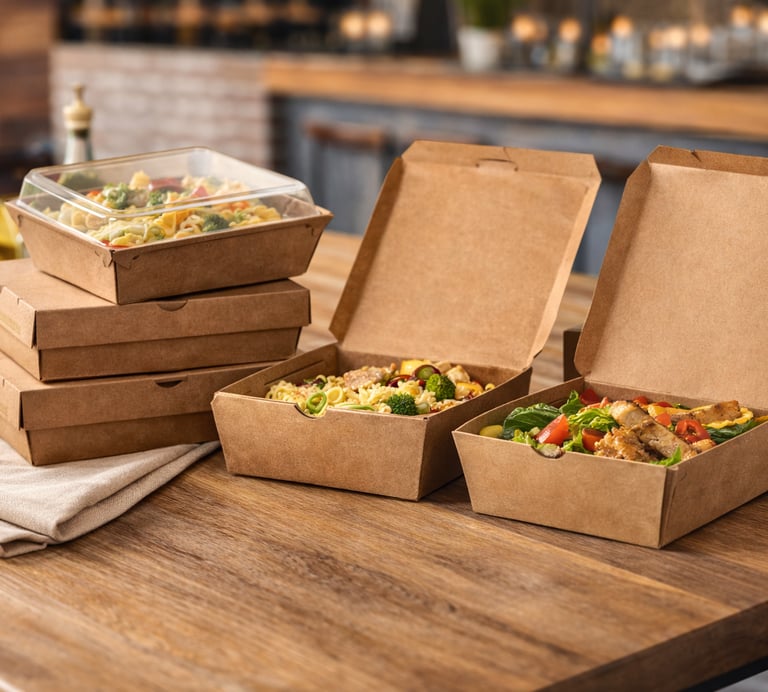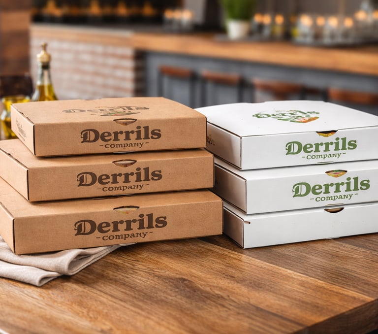 sacs krafts, Boites à Pizza, Lunch Boxes, Coffee Cups,... un large éventail d'emballages personnalisés selon vos besoins.