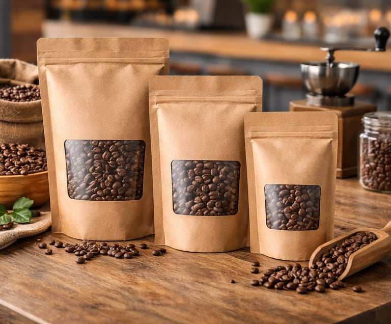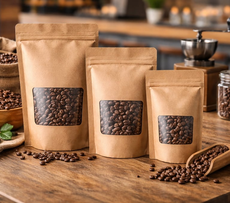 Un emballage papier responsable avec fenêtre pour une présentation soignée du café.